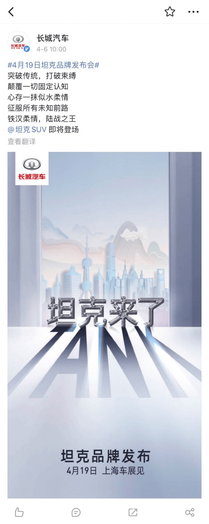 继哈弗、WEY、炮、欧拉后,长城汽车旗下全新品牌坦克终于来了!日前,长城汽车官方宣布,坦克品牌将在4月19日上海车展上正式独立,并配有专属LOGO。全新品牌LOGO以TANK的首字母“T”为主要元素,搭配银灰色的设计,有种“硬汉”风的感觉。