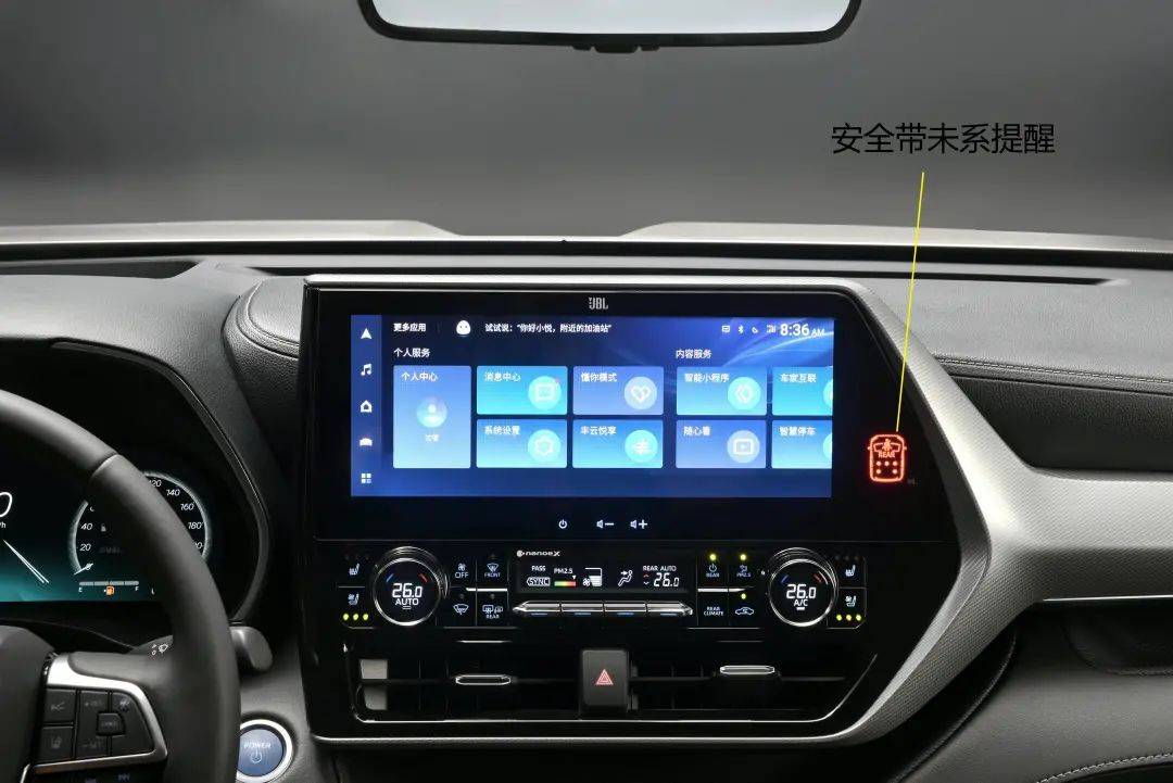而在现款汉兰达车型上一些很好的设计也延续到了全新车型上,比如现款车型中控台上贯通的储物槽,在全新车型上分割成了两个贯通的储物槽,同样非常实用。另外,全新车型也有一些新鲜的小设计,比如安全带未系提醒的显示就很有意思。