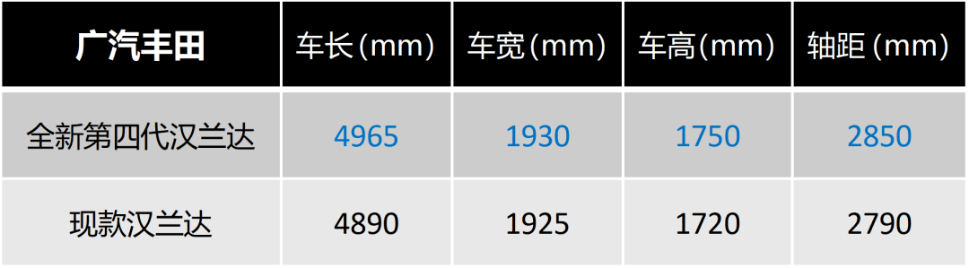 全新第四代汉兰达基于TNGA架构重新打造,所以它相比起现款车型来说,改变是非常彻底的。首先尺寸上就进行了全面的加大,相比现款车长加长了75mm,轴距加长了60mm,车宽和车高也有一定幅度增加。虽然倒不至于说让全新第四代汉兰达看起来比现款大很多,但对空间的影响一定是实打实的。