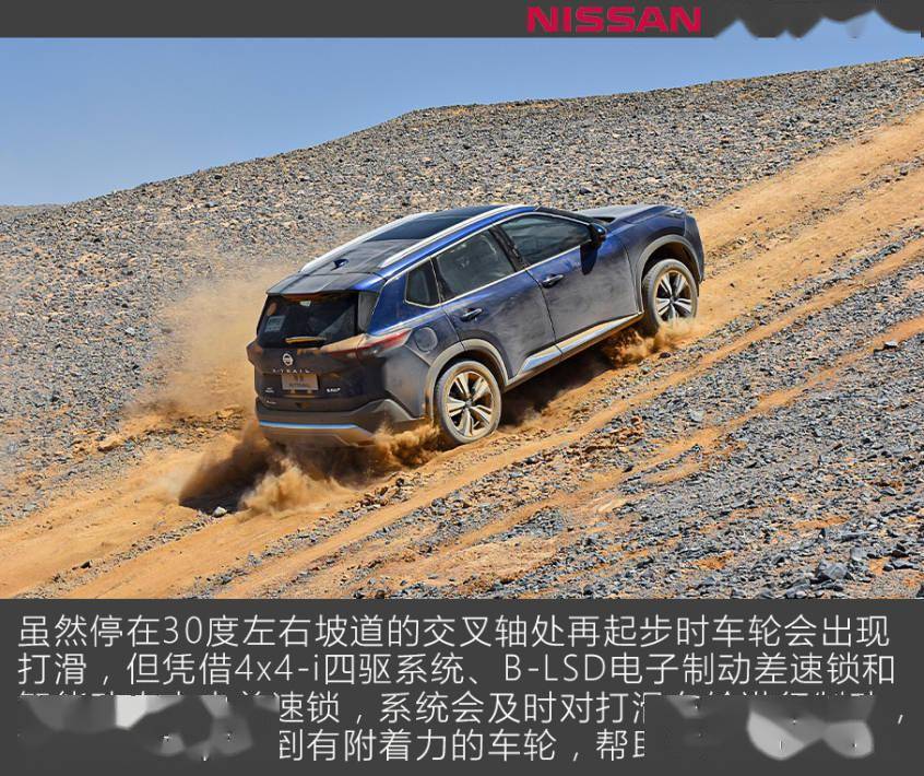 最后一个项目是爬陡坡,30度左右的坡道本身没有太大难度,虽然路面上满是砂石,但是只要将驾驶模式设置为越野模式,同时稳住油门就能轻松登顶。不过全新一代奇骏却要挑战更大的难度,在坡道上的交叉轴处驻停,再起步。