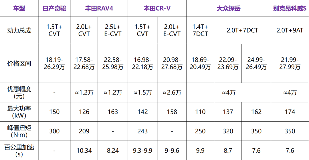 RAV4、CR-V和探岳均有高低排量、高低功率的区分,其中RAV4的2.0L版本动力相对较弱,但10秒出头破百的性能也足以满足日常需求,其余CR-V的1.5T、探岳的1.4T版都能实现10秒内破百。也就是说,如果对动力没有特别高的需求,这5款SUV都已经没有明显短板。