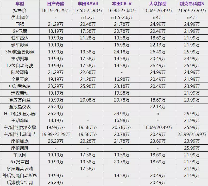 首先看四驱的价格门槛,RAV4是5款车型中最低的,优惠后19万出头就能买到2.0L的四驱版,CR-V优惠之后,1.5T四驱版的门槛则基本在20万出头。探岳和昂科威S的四驱版指导价都是24.99万起,好在各自优惠比较大,实际的四驱门槛大概在21万,和奇骏相当。