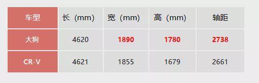 通过车身尺寸对比不难看出,大狗在车身尺寸方面的优势领先于CR-V,虽然CR-V在长度方面领先一点,不过在实际使用中这点优势可以忽略不计。