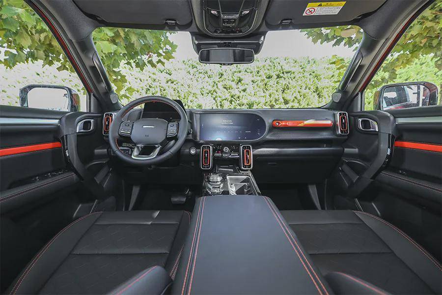 大狗的内饰设计延续了外观上硬派的风格,中控台的线条非常简洁,在车内使用了诸多橙色元素进行点缀,提升了整车时尚气息。车内全液晶仪表盘和12.3英寸中控液晶屏的加入,进一步提升了车内的科技化氛围,特别是12.3英寸中控液晶屏集成了哈弗最新的车机系统,支持包括在线导航、在线音乐等App在内的多种联网功能。