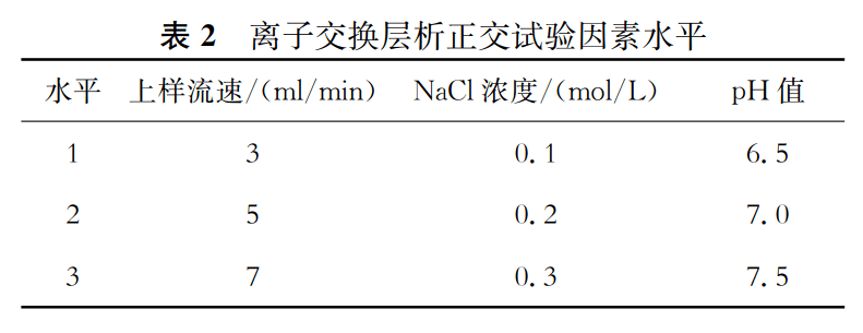 1.2.4 Capto Q离子交换层析条件优化超滤液2中加入PBS至终浓度为50 mmol/L、pH7.0后上样;采用正交试验设计L 9 (3 4 )对上样流速、PBS中NaCl浓度和pH进行优化,各因素水平见表2。同步使用示差和紫外两种检测器。