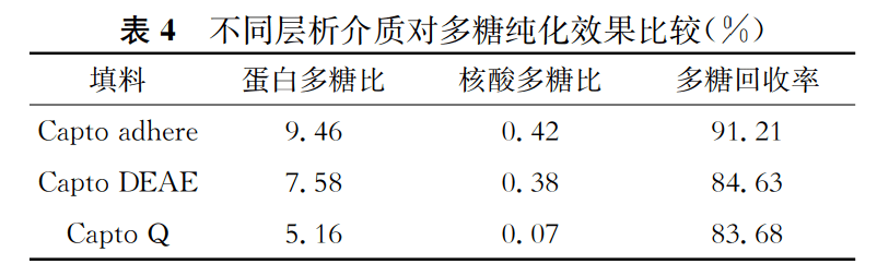 由于5型肺炎球菌荚膜多糖带负电荷,因此试验选择了3种不同的交换层析介质比较其对蛋白、核酸的去除效果及多糖回收率(表4)。经Capto adhere介质层析,多糖主要以流穿模式纯化析出,尽管多糖回收率较Capto DEAE和Capto Q更高,但是蛋白去除效果相对较差;Capto DEAE和Capto Q层析需收集多糖洗脱液,两者多糖回收率相近,但Capto Q对蛋白和核酸杂质的去除效果更为理想(表4)。