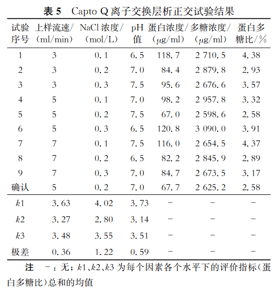 鉴于Capto Q层析介质对多糖纯化的良好效果,试验对上样流速和洗脱条件(NaCl浓度和pH)进行了三因素三水平正交优化试验,正交试验设计与结果分析见表5。以蛋白多糖比为评价指标,通过极差分析可知,洗脱缓冲液中的NaCl浓度为最主要影响因素。根据 k 值得出最优水平组合为上样流速5 ml/min,洗脱液为50 mmol/L PBS加0.2 mol/L NaCl,pH7.0;并对该条件进行了确认试验,所得洗脱液中蛋白多糖比进一步降低至2.58%(表5),核酸多糖比低于0.1%。