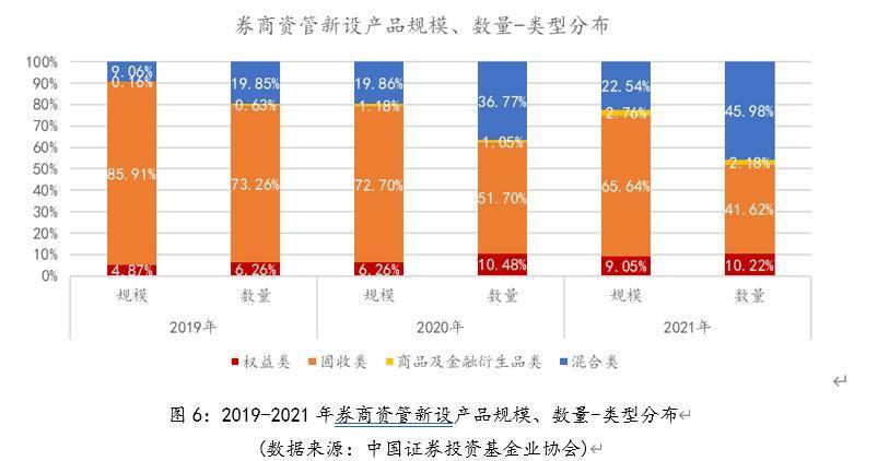 随着国民收入的不断提高和金融市场的日益成熟,居民资产配置意愿日益提升。在此背景下,仅配置单一类型的资产愈发难以满足大多数人的投资需求,多元化的资产配置需求也逐渐深入人心。根据基金业协会公布的产品备案数据,从2019年至2021年,证券公司私募资管业务新设产品中,固收类产品规模占比从85.91%降低至65.64%,产品数量占比从73.26%降低至41.62%;与此同时,混合产品规模占比从9.06%提高至22.54%,产品数量占比从19.85%提高至45.98%。从业务类型分布的变化可见,虽然证券公司私募资管业务当前仍以固收类业务为主,但混合类、权益类、商品及金融衍生品类产品均有大幅增长,策略重点逐渐从固收向固收+、以及多资产投资组合转移,以满足客户多样化的投资需求。