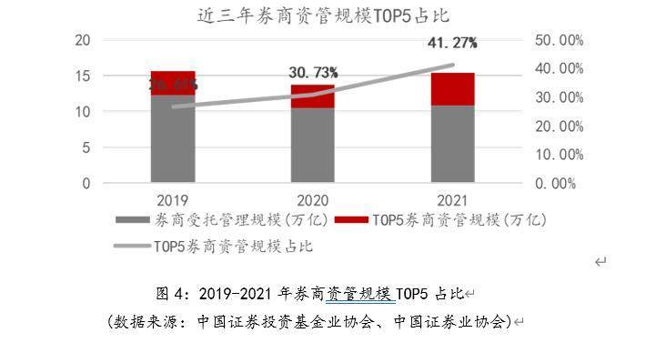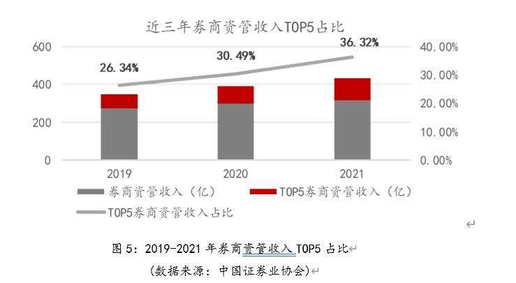 根据基金业协会和证券业协会公布数据统计,近年来证券公司资管业务规模的TOP5占比逐年提升,规模占比由2019年的26.61%提升至2021年的41.27%,收入占比由2019年的26.34%提升至2021年的36.32%。可见券商资管行业整体的规模和收入正加速向头部集中,行业马太效应愈加明显,且规模集中度更为明显,规模TOP5占比(41.27%)较收入TOP5占比(36.32%)更为向头部集中。