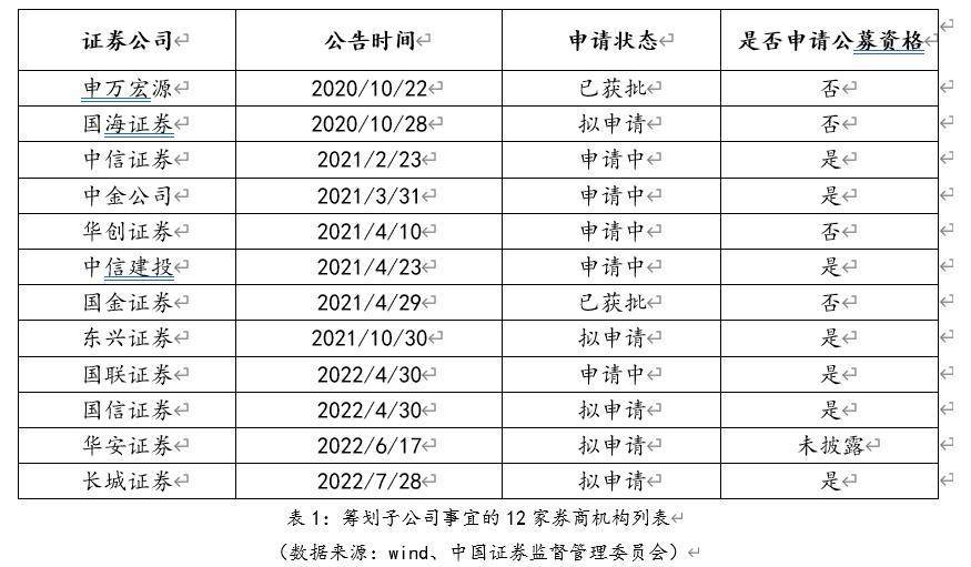 随着2022年5月底,《公开募集证券投资基金管理人监督管理办法》正式发布,“一参一控一牌”新规落地,券商资管往公募牌照方向发展是大势所趋。设立资管子公司并申请公募基金管理业务资格已成为券商资管未来发展的重大战略举措。根据wind公告信息及证监会公示信息统计,至少有以下12家证券公司筹划子公司事宜,其中7家同时筹划申请公募资格。
