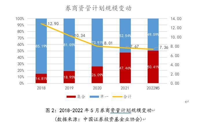 根据基金业协会最新公布数据,截至2022年5月,证券公司私募资管产品规模合计7.36亿元。与2018年底相比,在业务规模下降的过程中,业务结构发生了巨大调整,由单一计划占比80%以上的结构,调整为单一集合规模各占一半,并且集合产品规模首次超过了单一产品规模:新规前以通道业务为主的单一计划规模大幅缩减,由2018年末的10.99万亿压降至今年5月的3.65万亿,总降幅高达67%;集合业务规模则稳步提升,由2018年末的1.91万亿元增长至今年5月的3.71万亿元,增幅高达94%。