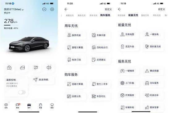 此外,在“蔚来”手机APP中,消费者可以查看车辆状态,并支持车辆解锁/上锁、后备厢开启、发送导航、温度控制等功能。与此同时,在该APP内还可以查看蔚来车友分享的日常生活,而根据消费者自身需求,还可以一键续保、上门补胎、洗车服务等,对于日常生活便利性有着大幅提升。