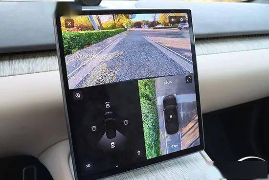驾驶辅助影像方面,蔚来ET7提供360度全景影像系统,并且得益于中控屏面积较大,屏幕内设置了三块区域,其中上方为车辆的正后方视角,左下方为调节车辆角度,右下方为车辆的全景影像,三个画面共同显示在一块屏幕中,为驾驶者带来极大的便利性。此外,在全景影像画面中还设置了车辆前后方与障碍物之间的距离,并且距离较为精准,更便于驾驶者对障碍物之间的距离作出判断。