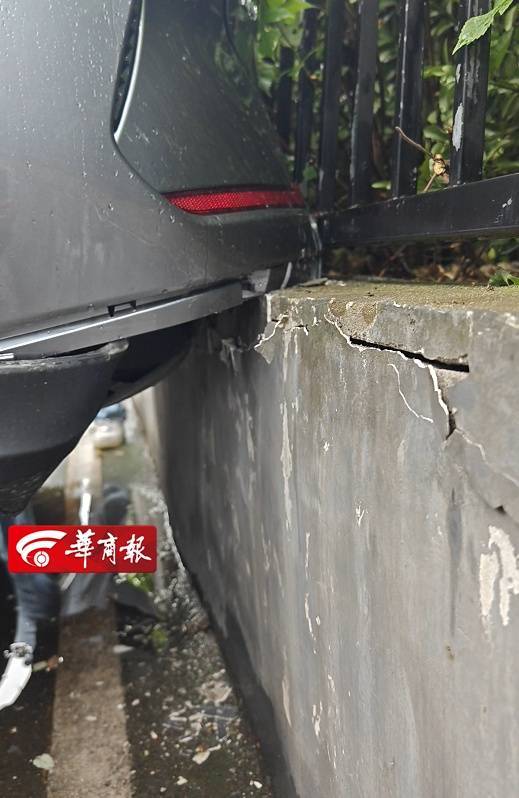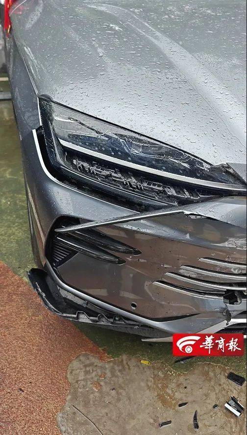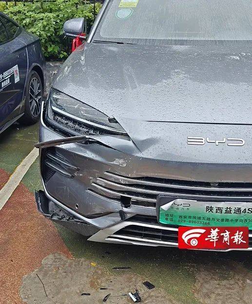 7月3日上午,华商报大风新闻记者来到比亚迪益通海洋店。周先生的新车被撞后未挪动位置,在现场能看到车的后杠与后备箱盖被撞得挨着后墙,车右前杠被撞坏的零件散落在地。