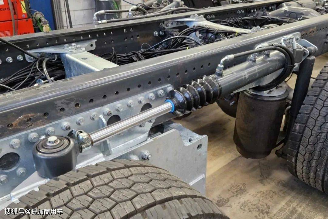 车辆的第二桥、第三桥都向前进行了移动,第四桥前方就显得空空如也,仅放置了低压电池、储气筒等底盘附件,留出了不少的距离,这不利于提升底盘利用率,但也是有原因的:车辆搭载了WideSpread后桥转向系统,该系统能够使后桥整体旋转,起到减小转弯半径、增强机动性并降低轮胎磨损的作用。