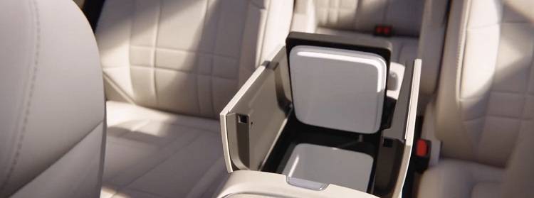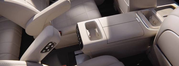 第二排依旧是两张独立VIP座椅,不过两个座椅的调节区域被设计在扶手内侧,功能包含座椅加热、通风、按摩以及电动调节等等。当然,第二排座椅也提供小桌板,方便后排乘客放置电脑或外卖等物品。