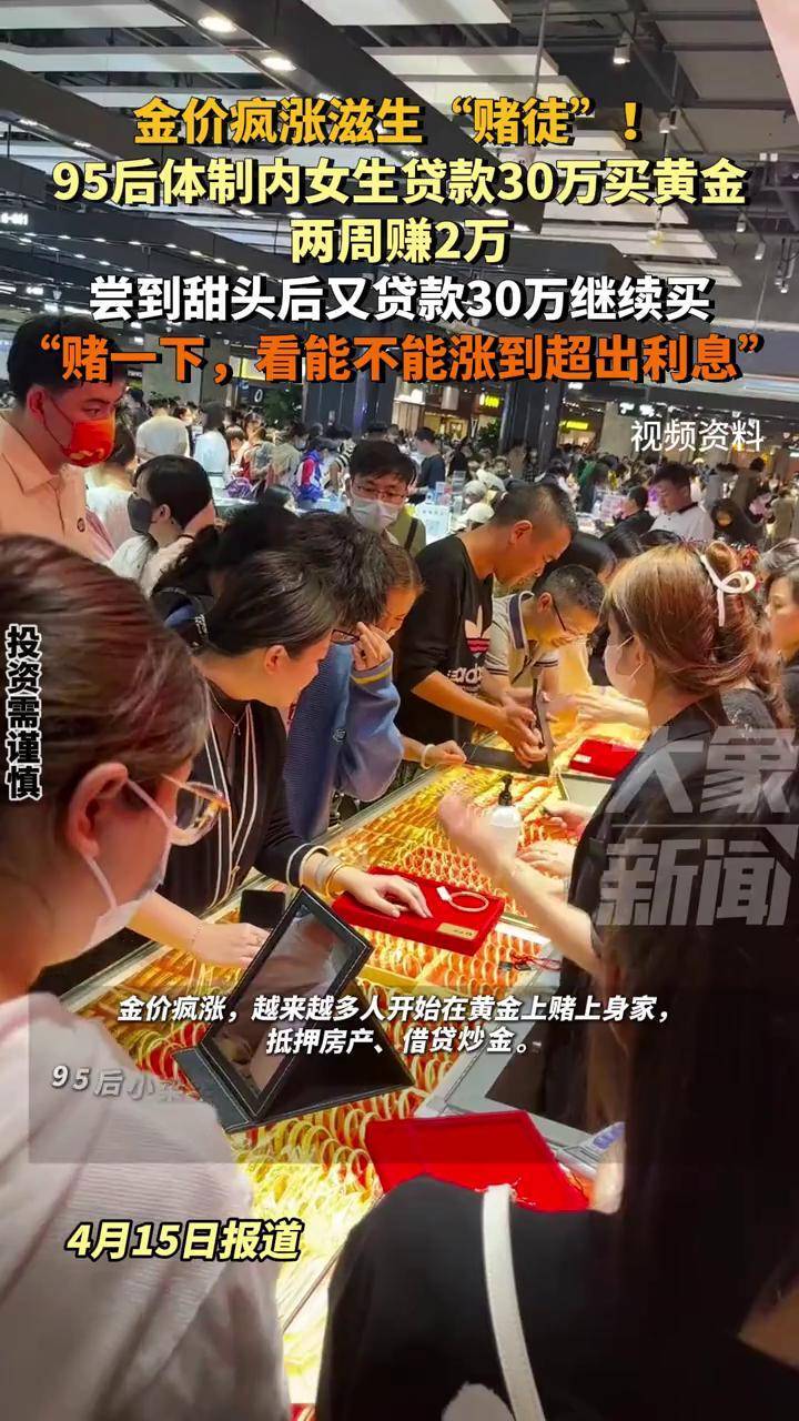 4月15日报道,金价疯涨滋生“赌徒”!95后体制内女生贷款30万买黄金两周赚2万,尝到甜头后又贷款30万买黄金,另一位买金者:赌一下,看黄金能不能涨到超出我的利息(凤凰网财经)