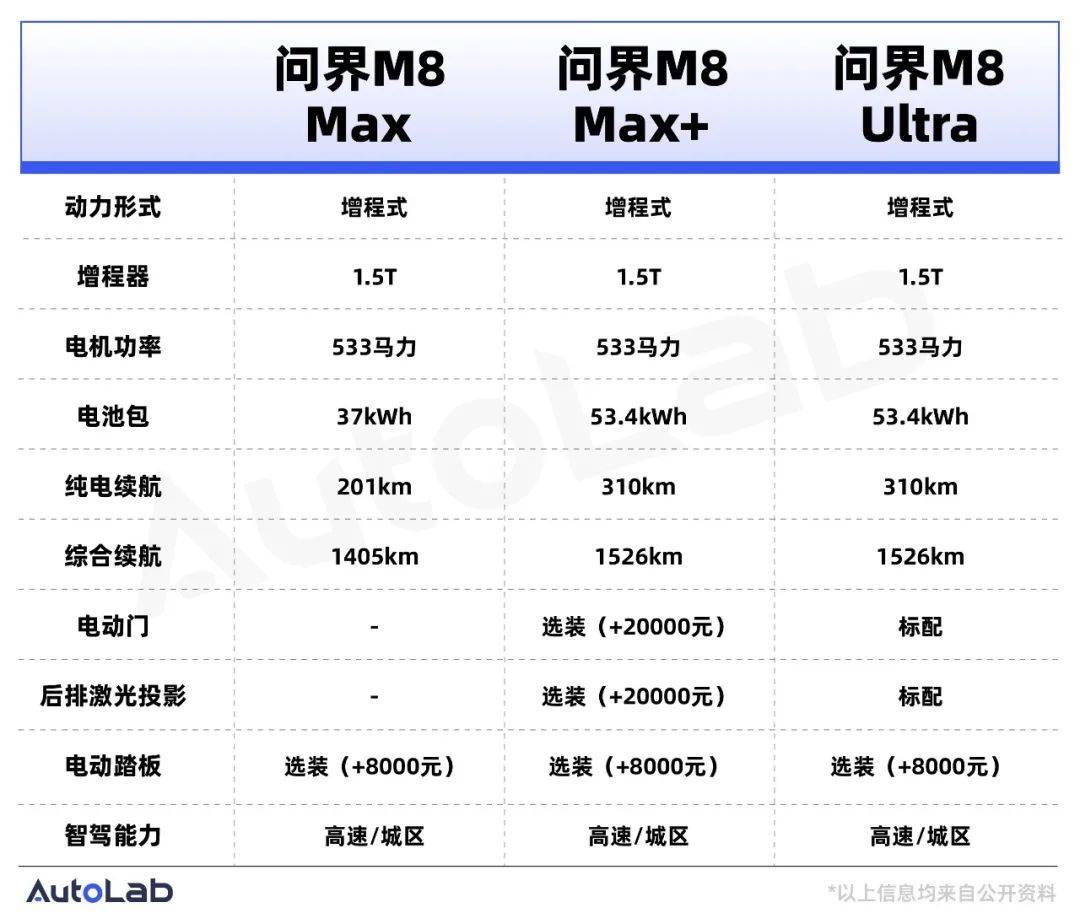 目前问界M8一共是有6个SKU,分别是5座的MAX、MAX+、Ultra版,和6座的MAX、MAX+、Ultra版。