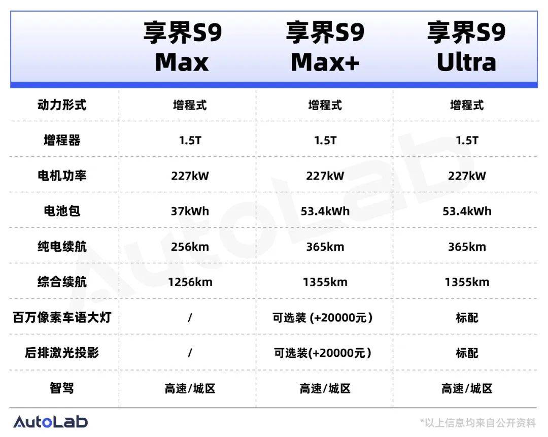 如果不考虑纯电版,目前享界S9增程系列共有Max、Max+、Ultra三个版本,售价分别为30.98万、33.98万和36.98万元。