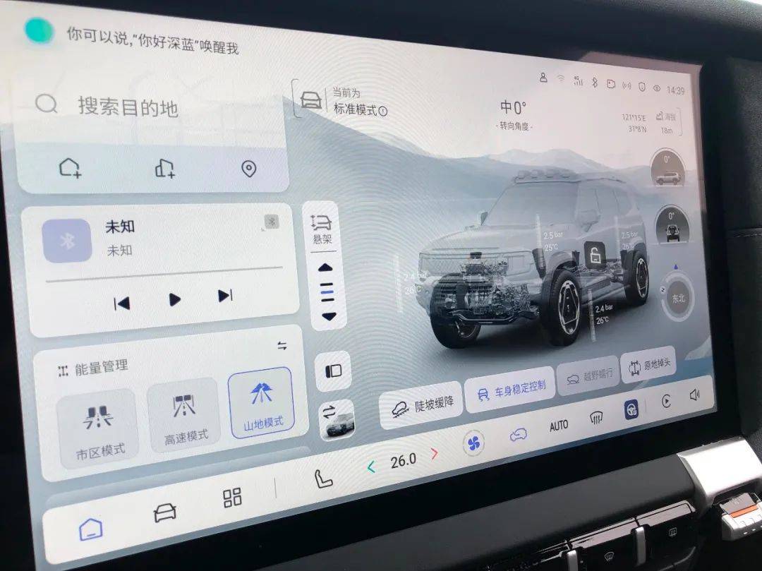 深蓝G318无忧穿越版集成了16种驾驶模式 ,囊括4种日常模式(经济模式、舒适模式、运动模式、自定义)、5种地形模式(涉水、雪地、崎岖、泥地、沙地模式)、3种特殊场景(原地掉头、陡坡缓降、越野蠕行)、4种能量管理模式(市区、高速、山地、云端智能能量管理),覆盖多地形、多路况模式。