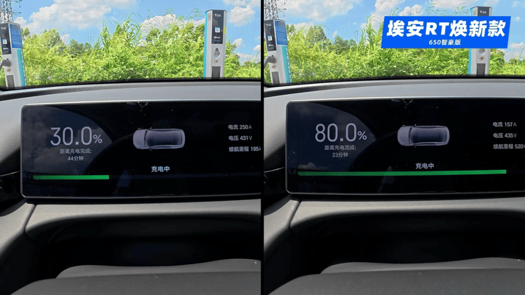 充电体验上,埃安RT焕新款支持3C快充,峰值功率可达150kW,经过我们的实际测试,30%到80%充电仅需21分钟,对比之下,秦L EV充电至同样电量则需要31分钟。