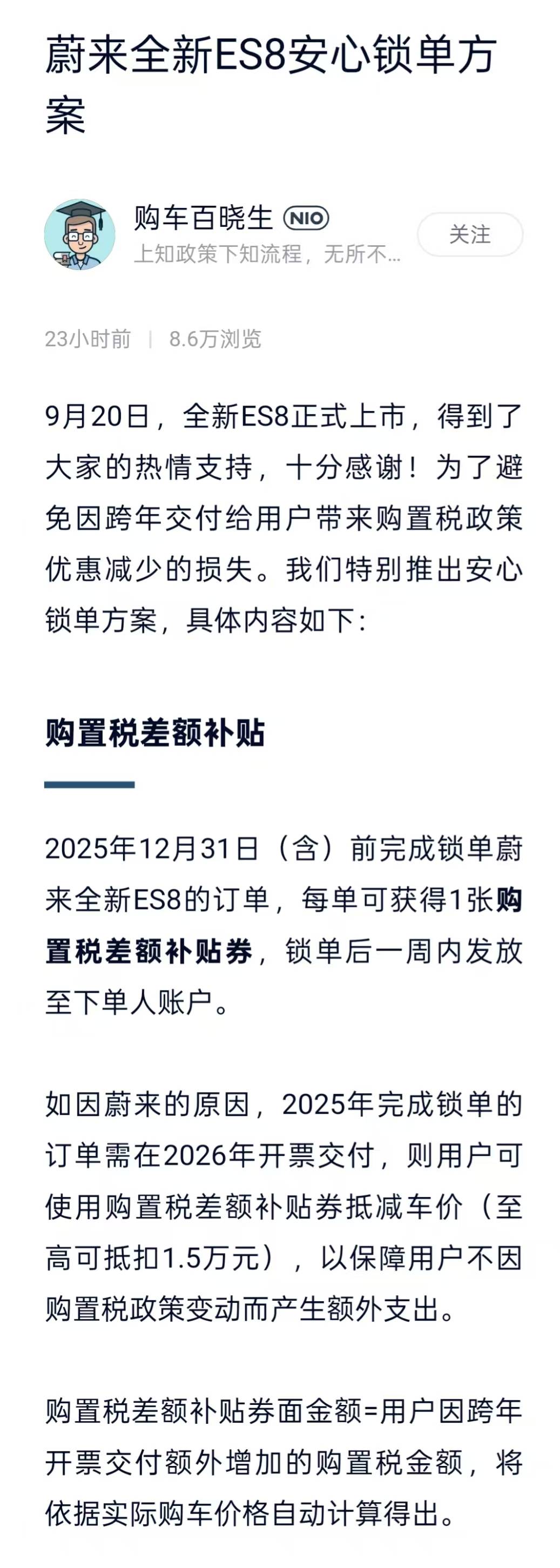 2、如因蔚来的原因,2025年完成锁单的订单需在2026年开票交付,则用户可使用购置税差额补贴券抵减车价(至高可抵扣1.5万元),以保障用户不因购置税政策变动而产生额外支出。