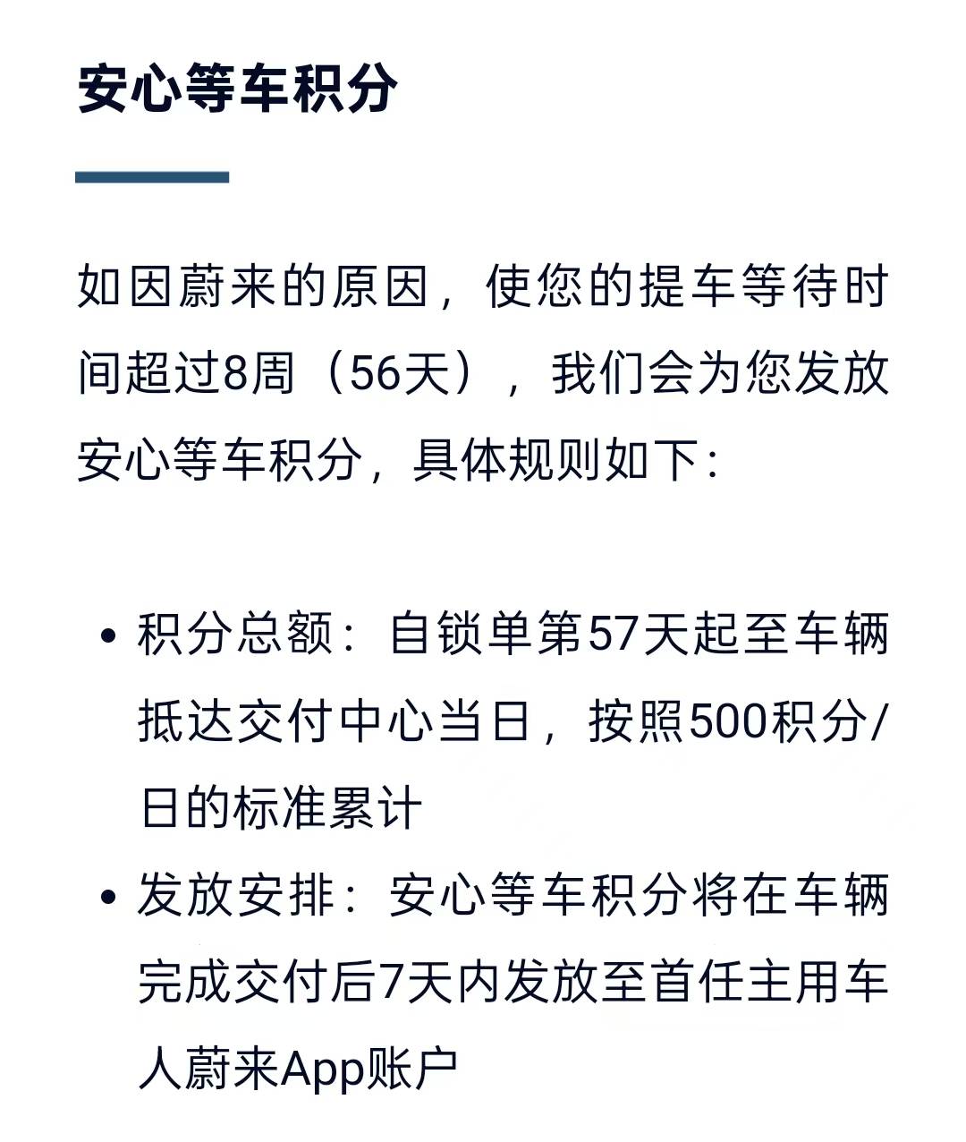 4.提车等待时间超过8周(56天),就可获得500积分/日的补偿,直至车辆抵达交付中心当日。