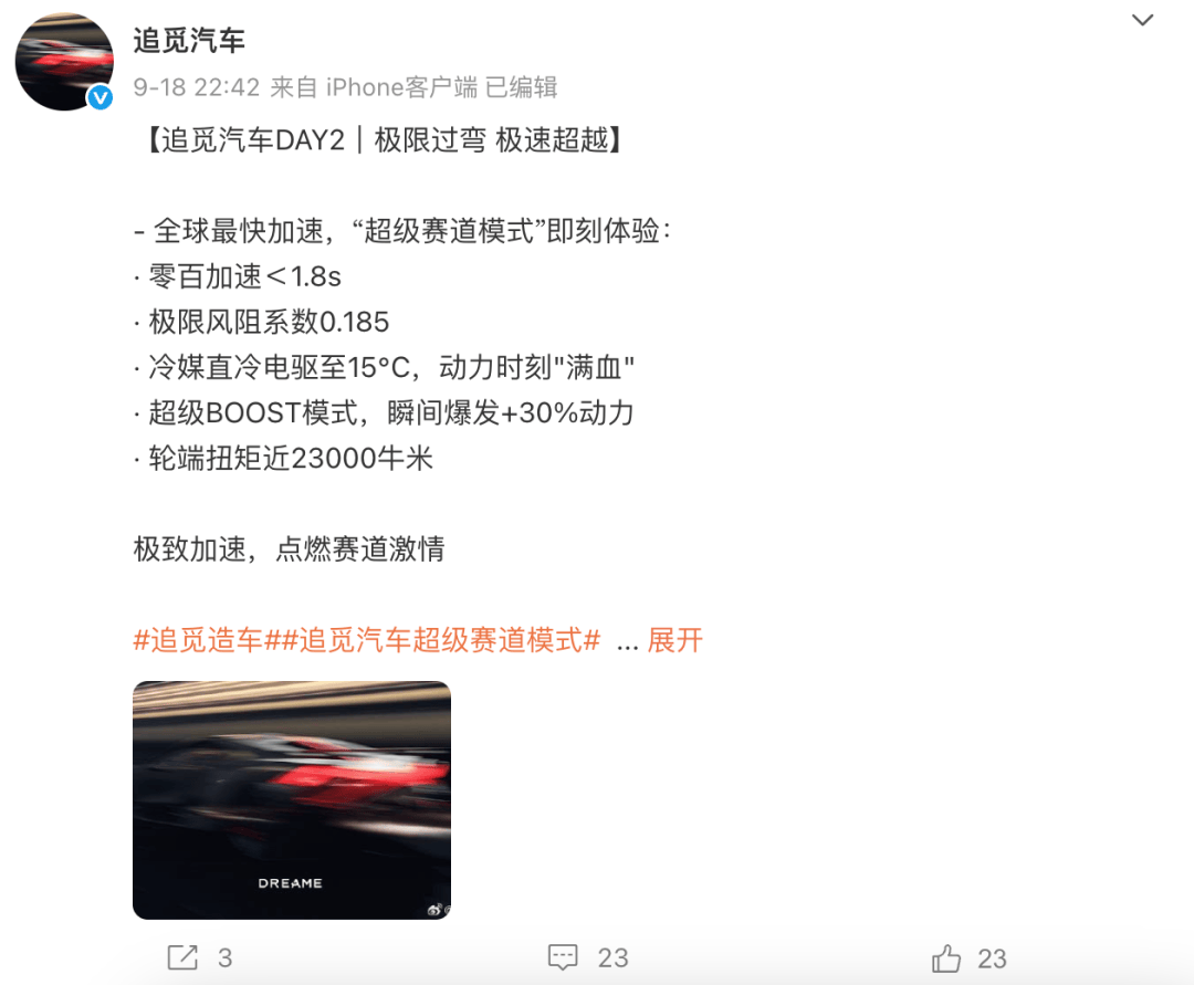 如果追觅汽车这个零百加速性能量产之后不缩水,那么追觅汽车首款产品将成为目前零百最快的新能源车。