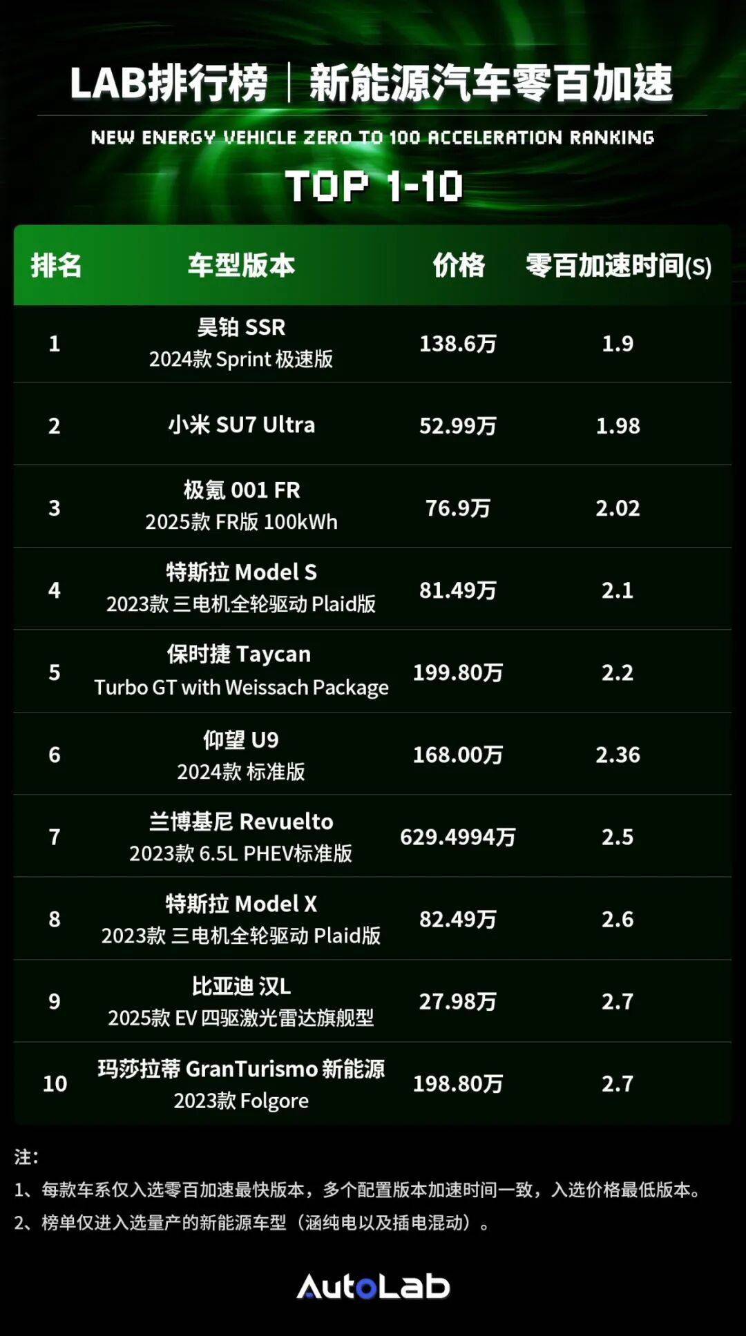 比如零百加速小于1.8s,此前我们做过一个《零百最快新能源车排行榜》,我们在这里也附上最新版。