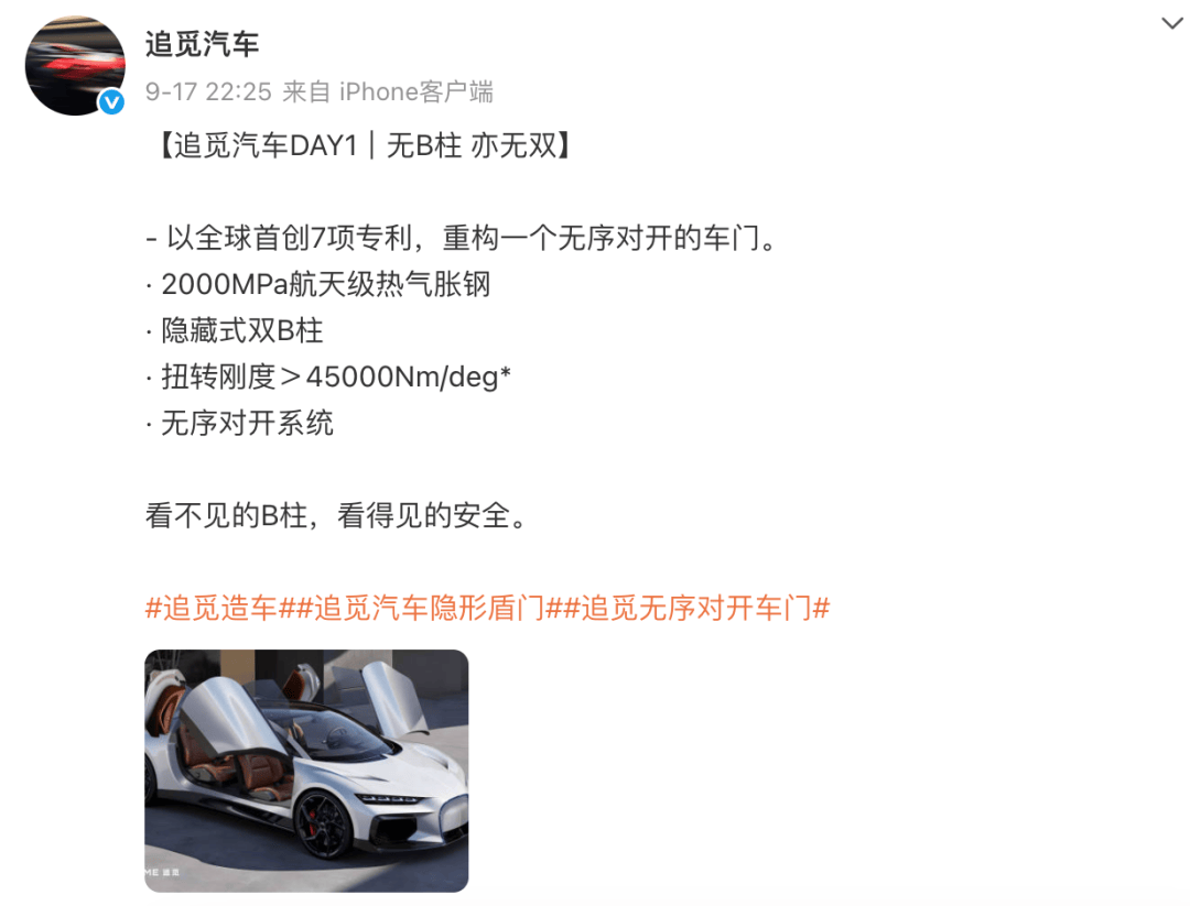 比如追觅首条官微的内容就很有话题性,抛开这个概念图中形似布加迪的产品造型不说,对开式双蝴蝶门的造型,在目前量产车中也还从来没有见到过。