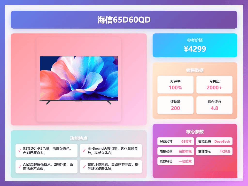 推荐理由:这台海信65D60QD的264Hz疾速高刷,让你看电影不卡顿、玩游戏特别流畅,画面更顺滑,减少拖影,体验很自然。它的U+超画质引擎Pro采用AI调节,无论是看影片还是在线内容,色彩更鲜亮,细节更丰富,画质提升明显。每一帧都更清晰,效果真是不错。