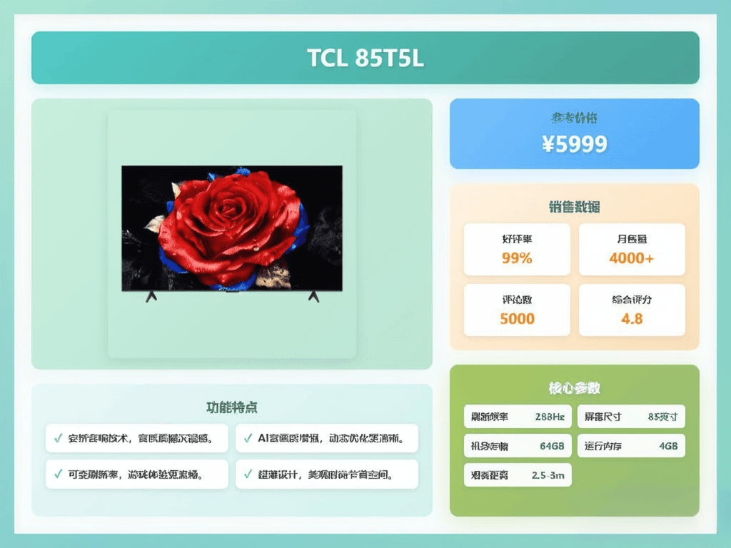 推荐理由:这款TCL 85T5L采用了量子点Pro 2025技术,能够实现96%的超高色域,呈现出更加鲜艳自然的色彩,视觉效果还挺震撼的。无论看电影还是玩游戏,色彩表现都很出色,让你真的能沉浸其中。