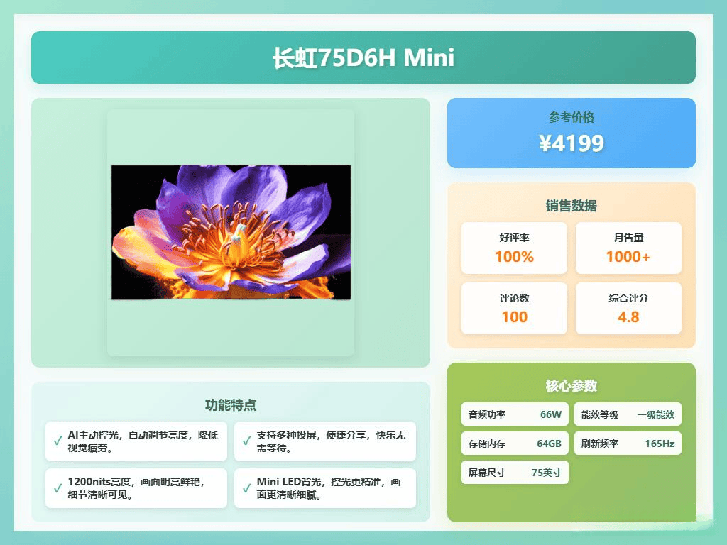 推荐理由:这款长虹75D6H Mini电视带来影院级的视觉体验,大屏幕看电影、追剧都特别震撼。采用Mini LED背光技术,能提供更细腻的画面层次和更高的对比度,画面边缘过渡更自然,细节更清晰。200-300级背光分区让亮部和暗部都能得到精准控制,画面更具真实感。