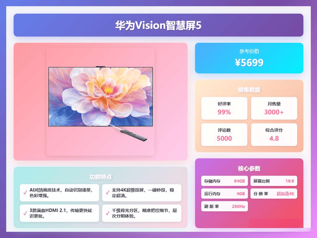 推荐理由:这台华为Vision智慧屏5采用Super MiniLED技术,让画面细节表现得更丰富,明暗层次都能轻松掌握。千级背光分区,可以精准控制亮暗部分,让画质看起来更加细腻自然。它还具备AI明晰控光算法,自动调节亮度和光线效果,让画面看起来更清楚、更有层次感,观看体验更舒服。