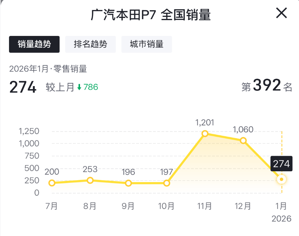 从这个层面来讲,2026年1月份,广汽本田P7单月销量下滑较为严重,或许是广汽本田整体处境的一个缩影。
