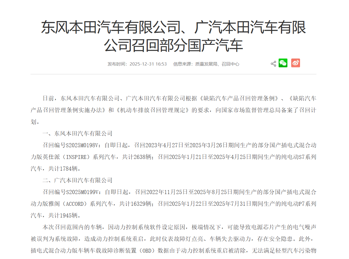 国家市场监督管理总局官网信息显示,由于动力控制系统软件设定原因,极端情况下可能导致车辆失去驱动力,广汽本田宣布召回生产日期在2025年1月22日至2025年7月31日期间的纯电动P7系列汽车,共计1945辆。
