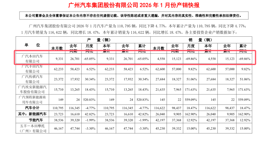 2026年1月份,广汽本田的销量表现,更是让人“难以置信”。广汽集团官方数据显示,2026年1月份,广汽本田的单月销量仅为4558台,不足5000台。